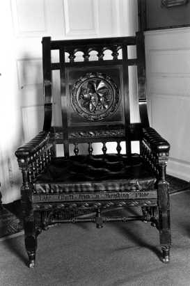 The chair is described as a “black-stained Eastlake-style armchair” made from the wood of the “Spreading Chestnut Tree” by H. Edgar Hartwell of Boston. The seat was tufted leather, the seat rail carved in the gothic or black-letter style with a portion of the verse from the original poem etched around the rails: