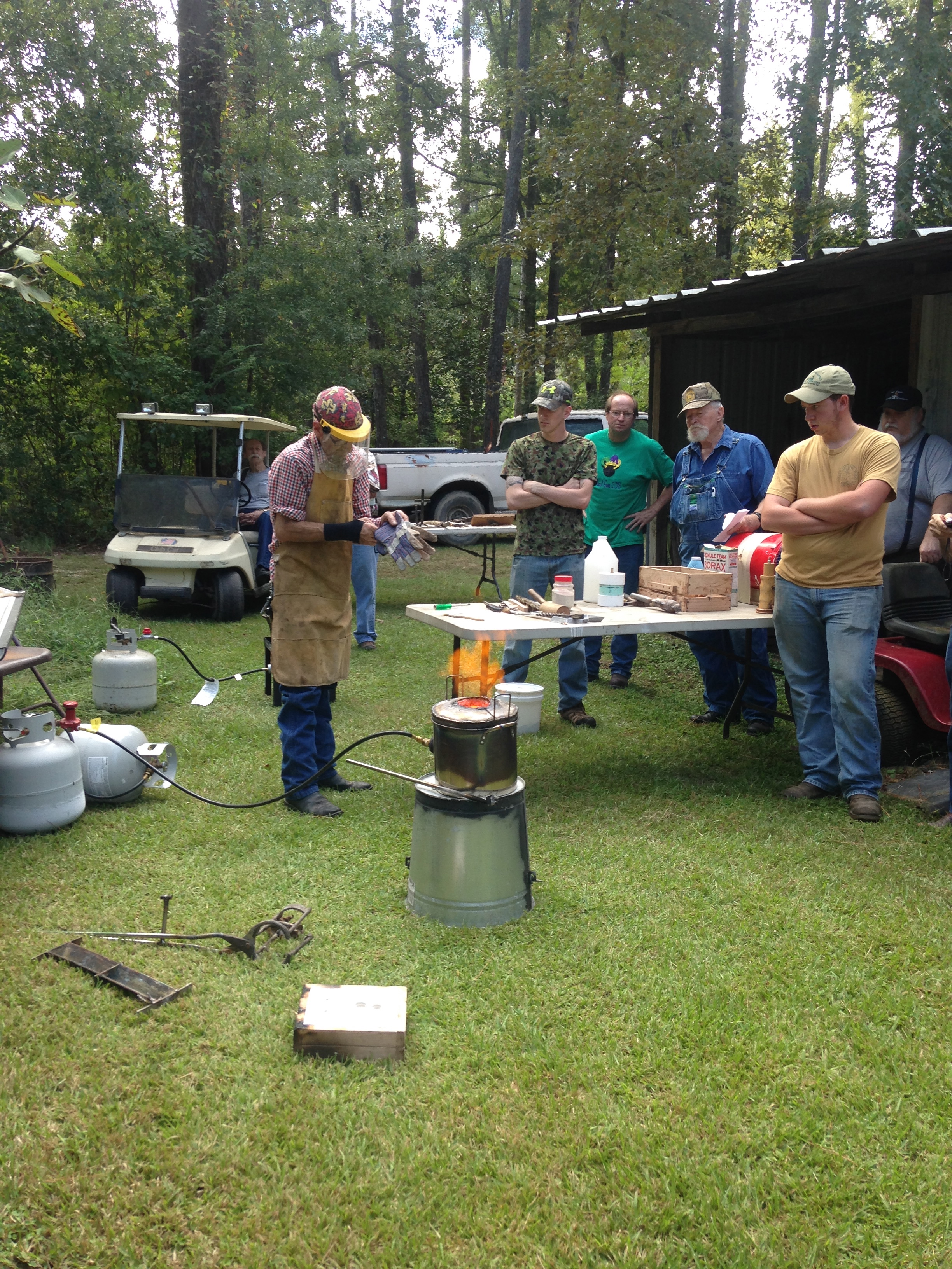 Attention soon turned to the forges and work began. Several members brought interesting examples of portable forges but one was of special interest. Fifteen year old Garrett O’Hare showed his creative ingenuity with a forge and blower system he designed and built himself. This forge prove to be quite functional as Garrett was forging his knife.